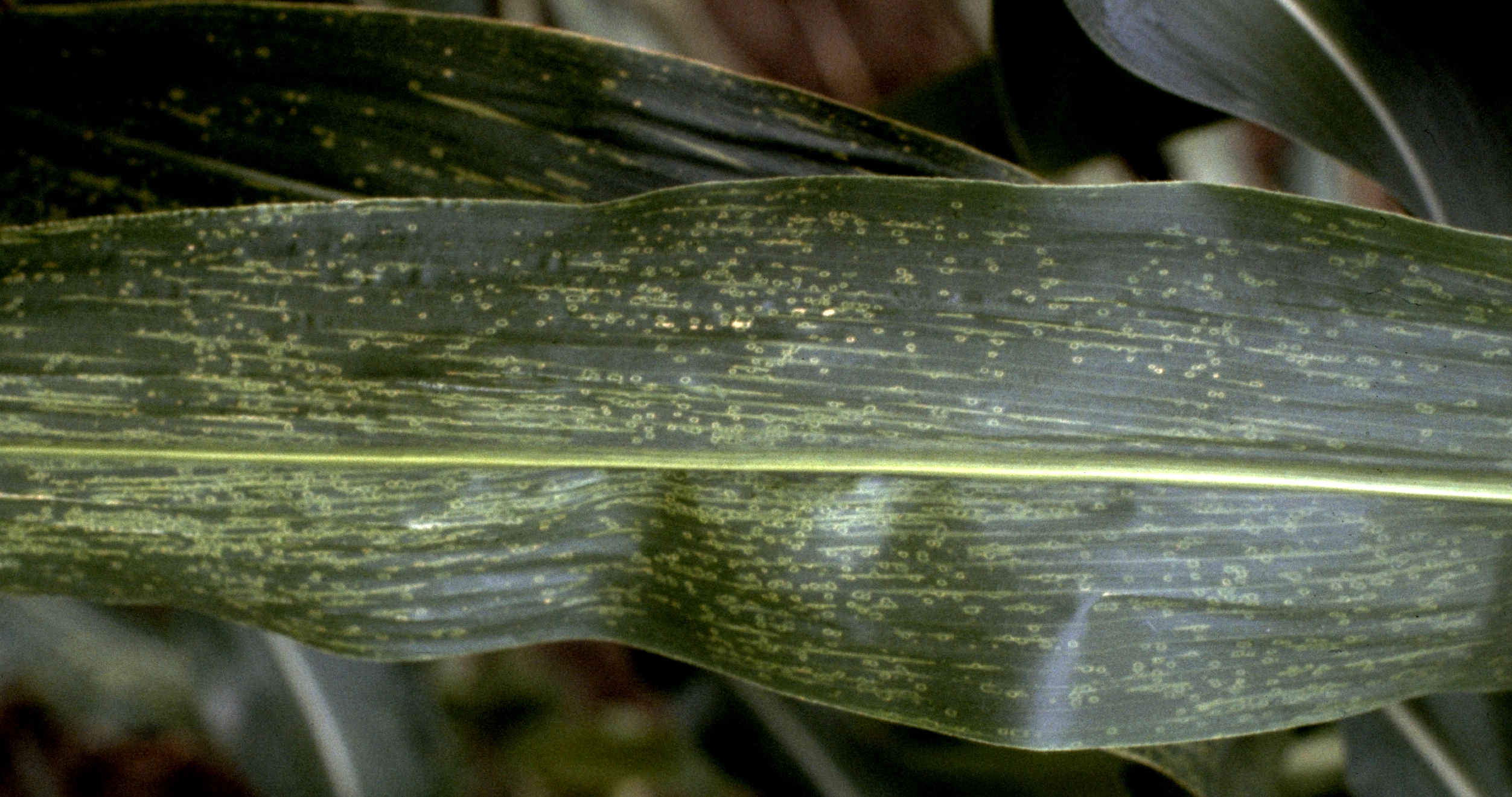 lesion mimic: Eighth leaf of a homozygous les*-N1399B mutant plant, showing frequent tiny round chlorotic lesions with dark centers and many small longitudinal necrotic streaks along leaf veins.