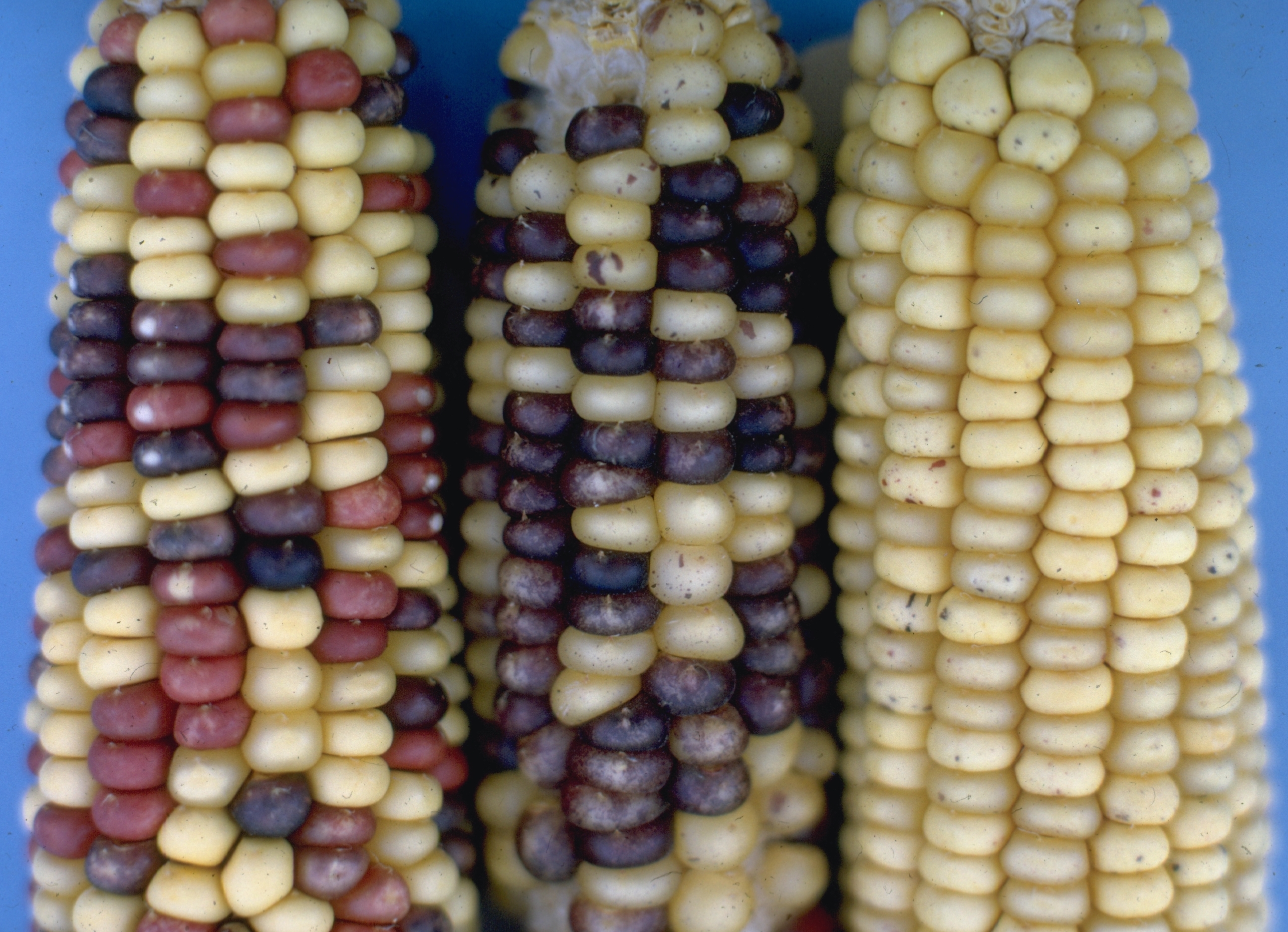 Paramutation at the R1 locus: (Brink 1968). Phenomenon through which certain alleles (R-st and R-mb), when in a heterozygote with standard R1, cause R1 to change regularly to a weaker aleurone color form designated R1'. Ears are from the cross of a heavy mottled r1 r1 female by (1) R1 R-st, (2) R1 R-st nonparamutagenic, (3) R1 R-st paramutagenic. Note that the r1 r1 R1 kernels appear colorless on the right ear while they are heavily colored on the other ears.