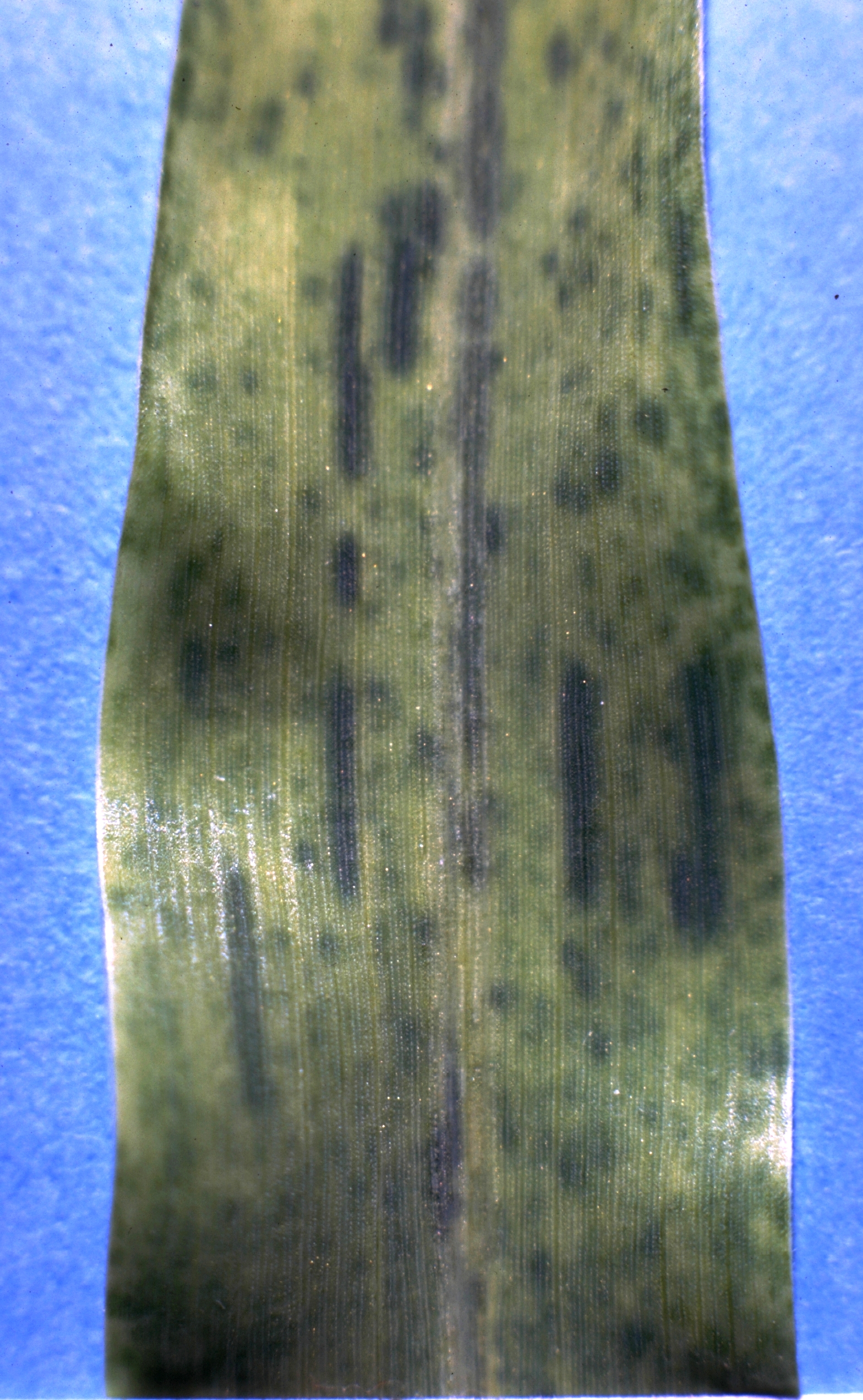 Speckled-Lesion: First 2 leaves of a spt1-N278B, M2 spotted mutant seedling (center) showing patches and crossbands of pale green with dark green spots depending on diurnally variable conditions. Image also shows first 2 leaves of yellowish white mutant (wl*-N278A)